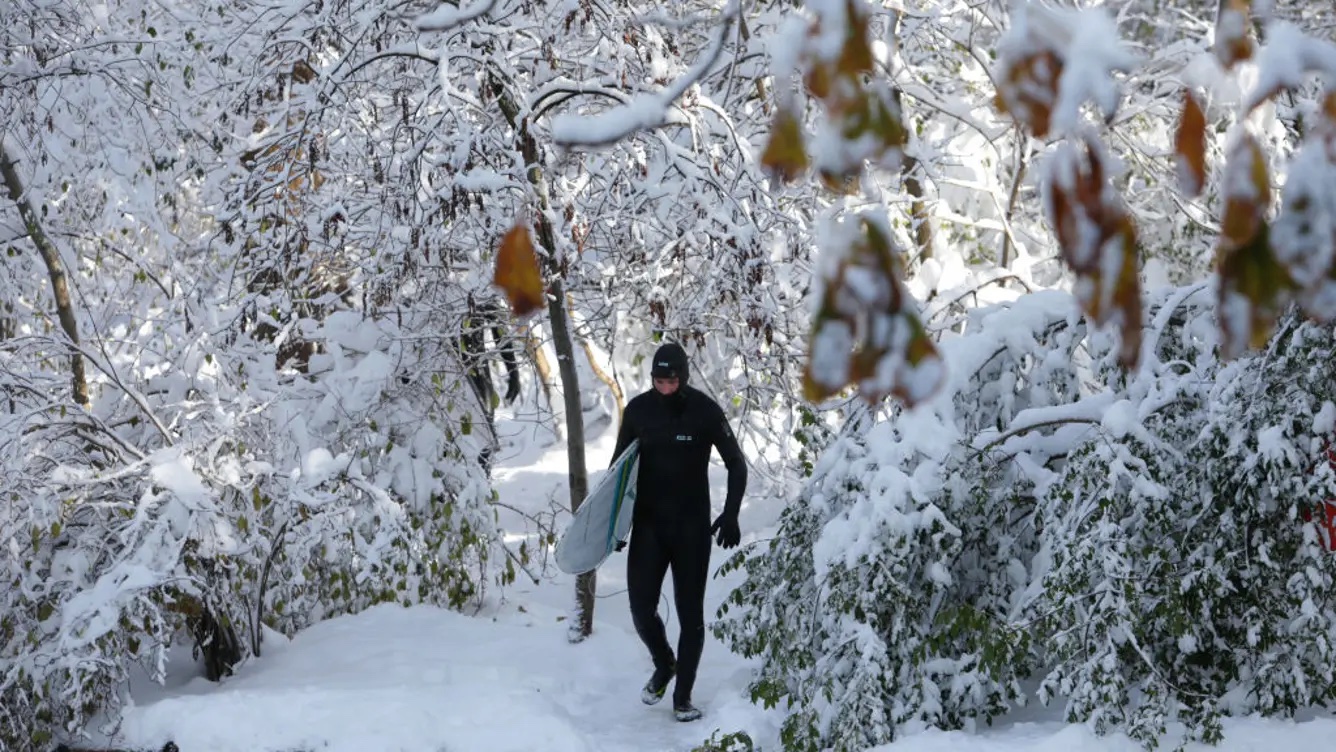 Серферы выстраивались в гидрокостюмах круглый год, в то время как туристы заполоняли мост выше, чтобы наблюдать, как серферы катаются по ледяной воде.