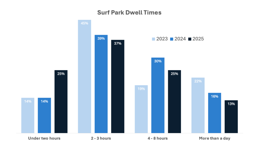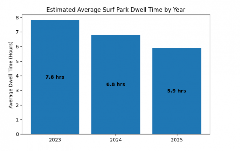 Эта тенденция важна: она указывает на то, что серф-парки все чаще ориентируются на посещения продолжительностью полдня, это достаточно продолжительное время, чтобы обеспечить значительные расходы на еду и напитки, розничную торговлю и сопутствующие услуги, но достаточно короткие, чтобы вписаться в местную или региональную поездку, а не в путешествие в какой-либо конкретный город. Другими словами, среднее время пребывания сокращается, поскольку экстремально длительные пребывания уходят в прошлое. Рост сегмента от 4 до 8 часов указывает на то, что серф-парки занимают позицию «основного вида деятельности в рамках более широкого многофункционального комплекса». Сегмент экстремально длительных пребываний может снова стать актуальным по мере того, как все чаще будут открываться серф-парки курортного типа с отелями и удобствами, ориентированными на привлечение посетителей на несколько дней.