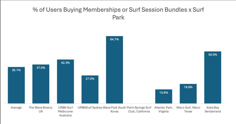 35% посетителей серф-парков сообщают о покупке абонементов или комплектов услуг, что на 5% больше, чем годом ранее. Анализ абонементов и комплектов услуг в разных серф-парках показывает, что в большинстве городских серф-парков не менее 25% посетителей приобретают комплекты или абонементы, до 64% в WavePark в Южной Корее и 50% в Alaia Bay, Швейцария.