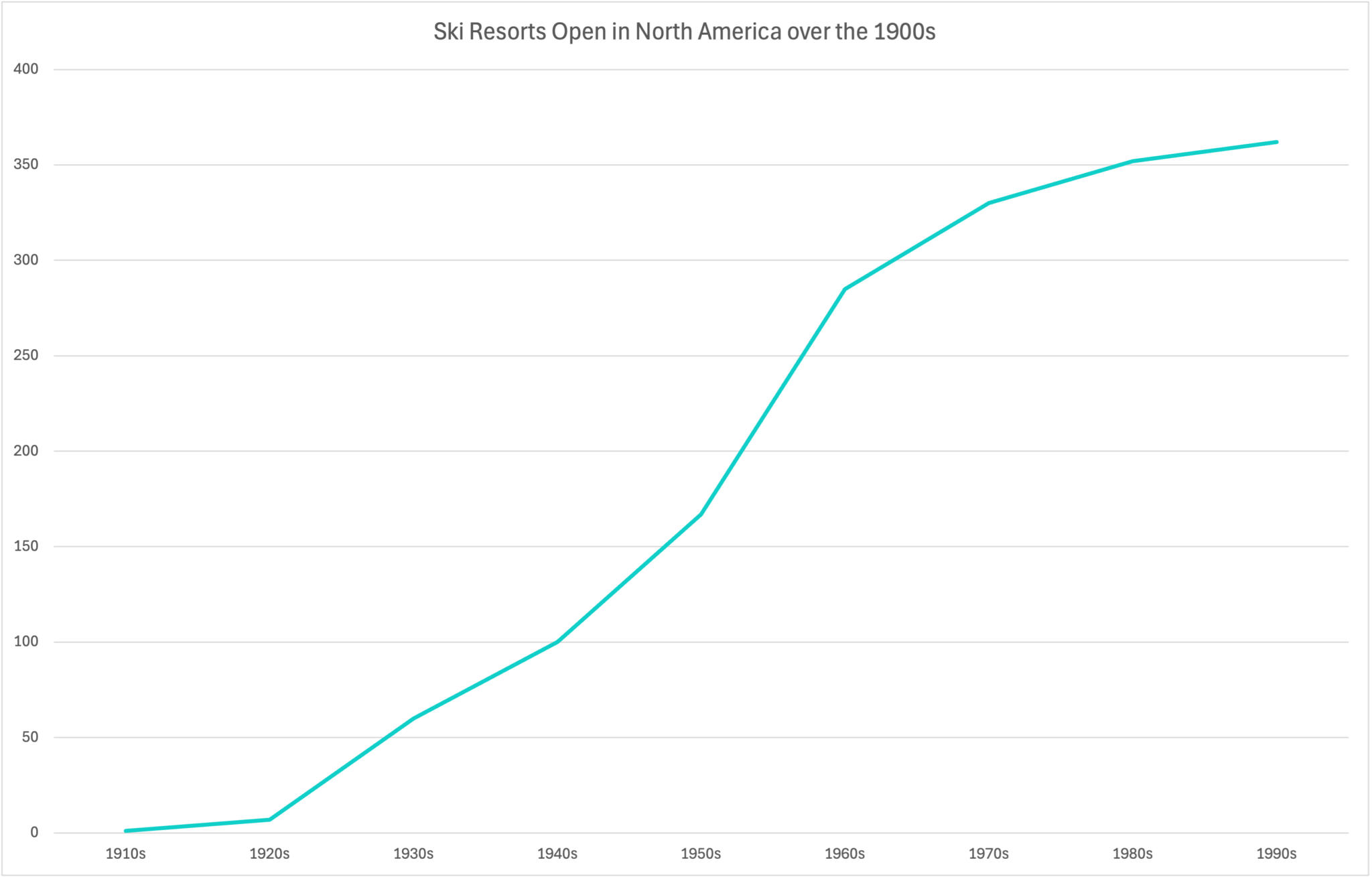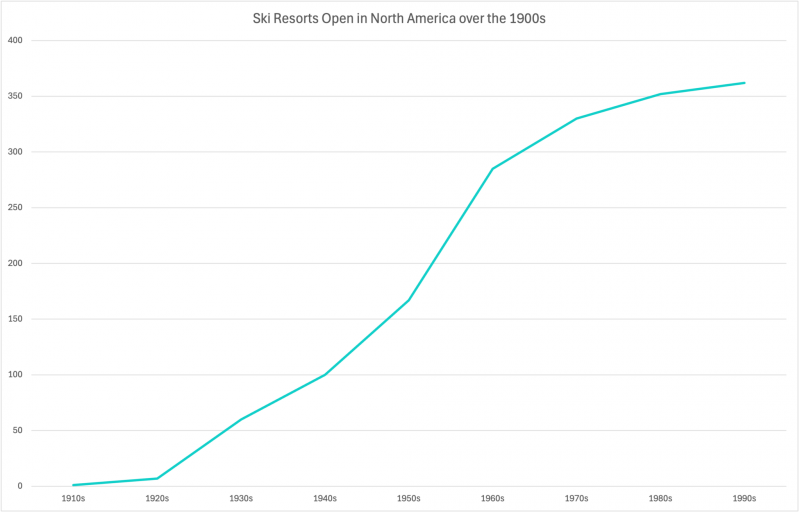 Таблица 3: Динамика открытия горнолыжных курортов в Северной Америке с 1900 года.